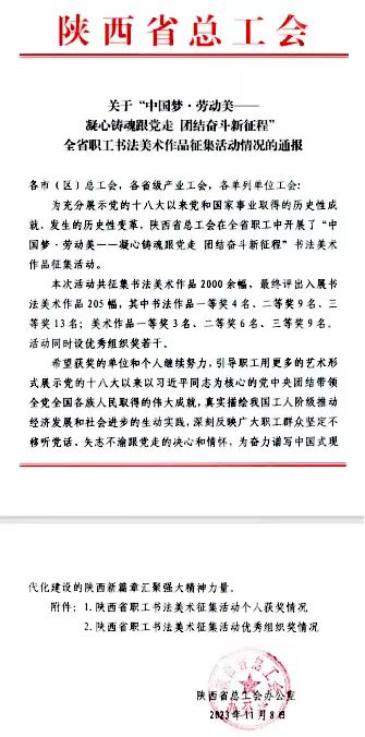 Beat365官网原春鸣老师在陕西省 “中国梦·劳动美”全省职工书画大赛中获二等奖。
