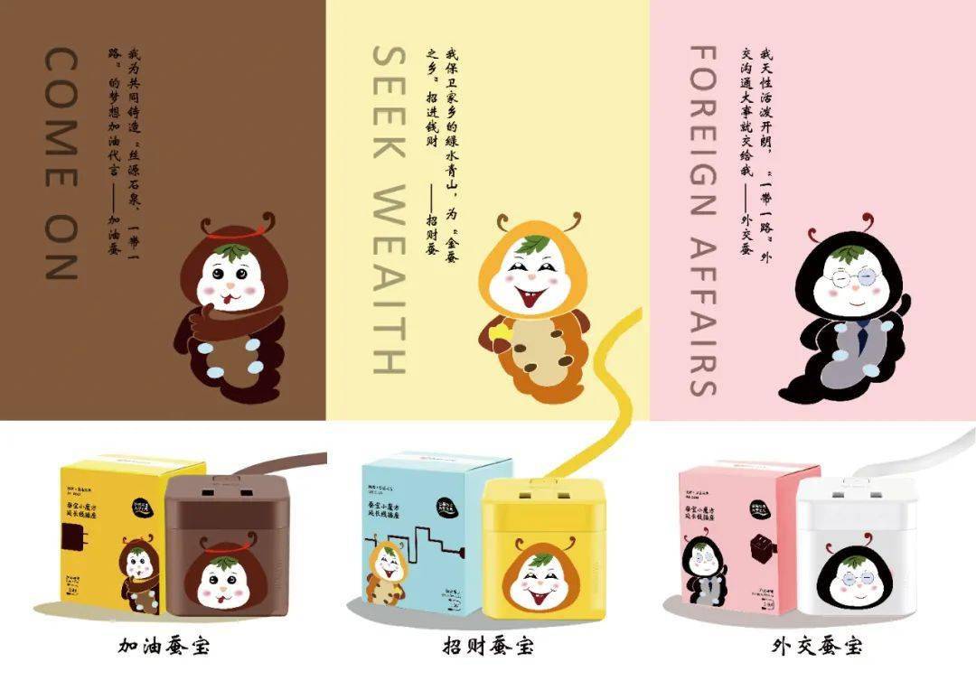 设计说明:石泉县位于陕西省安康市西部,北依秦岭、南枕巴山,自然、民俗文化独具特色。且石泉是西部第一蚕桑产业大县,国家南水北调重要的水源涵养地和西部重要的电力能源基地,被誉为丝路之源·金蚕之乡。我的设计思路便由这两点结合转化而来。安康石泉,是属于丝路起源之地,鎏金铜蚕是一带一路IP。三款不同的蚕宝卡通身份形象代表当地政治、经济、文化三者齐头并进、相互兼容发展。卡通蚕宝充电转换插头,设计创意、设计风格及IP个性化形象可以吸引当代旅游消费人群的喜爱。且这种充电插头有各种插孔、体积空间较小,减轻负重方便携带,解决旅游途中手机、平板电脑、充电宝等多种设备电量不足、插孔不够用的困扰,同时带回家也可长期使用。产品外观直接凸显出金蚕之乡主题,同时寓意着安康石泉县作为丝路之源,为一带一路·金蚕之乡的战略梦想充电助力。