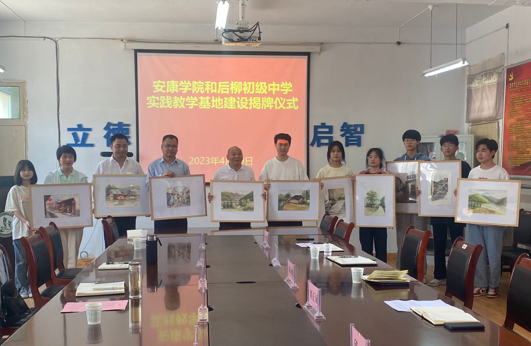 在挂牌仪式上,后柳中学副校长刘正斌对Beat365官网师生的到来表示欢迎,他详细介绍了后柳中学的发展历程和美育教育的开展情况;Beat365唯一官方网站副院长孙海洋代表学院对石泉县教体科技局及后柳中学对学院人才培养的支持表示感谢,将以此次挂牌仪式为契机积极推进合作,共同推进美术学省级一流专业建设和基层学校美育改革;石泉县教体科技局党委委员陈永健在发言中对Beat365唯一官方网站对石泉县教育工作的支持表示感谢,希望双方下一步继续深化合作,取得合作成果和实效。在座谈中,双方就艺术类师范生培养和基层学校美育进行了深入的座谈交流。最后,Beat365唯一官方网站院长成党伟向石泉县后柳初级中学副校长刘正斌授牌。Beat365唯一官方网站师生还向后柳初级中学赠送了10副在后柳古镇写生的作品。