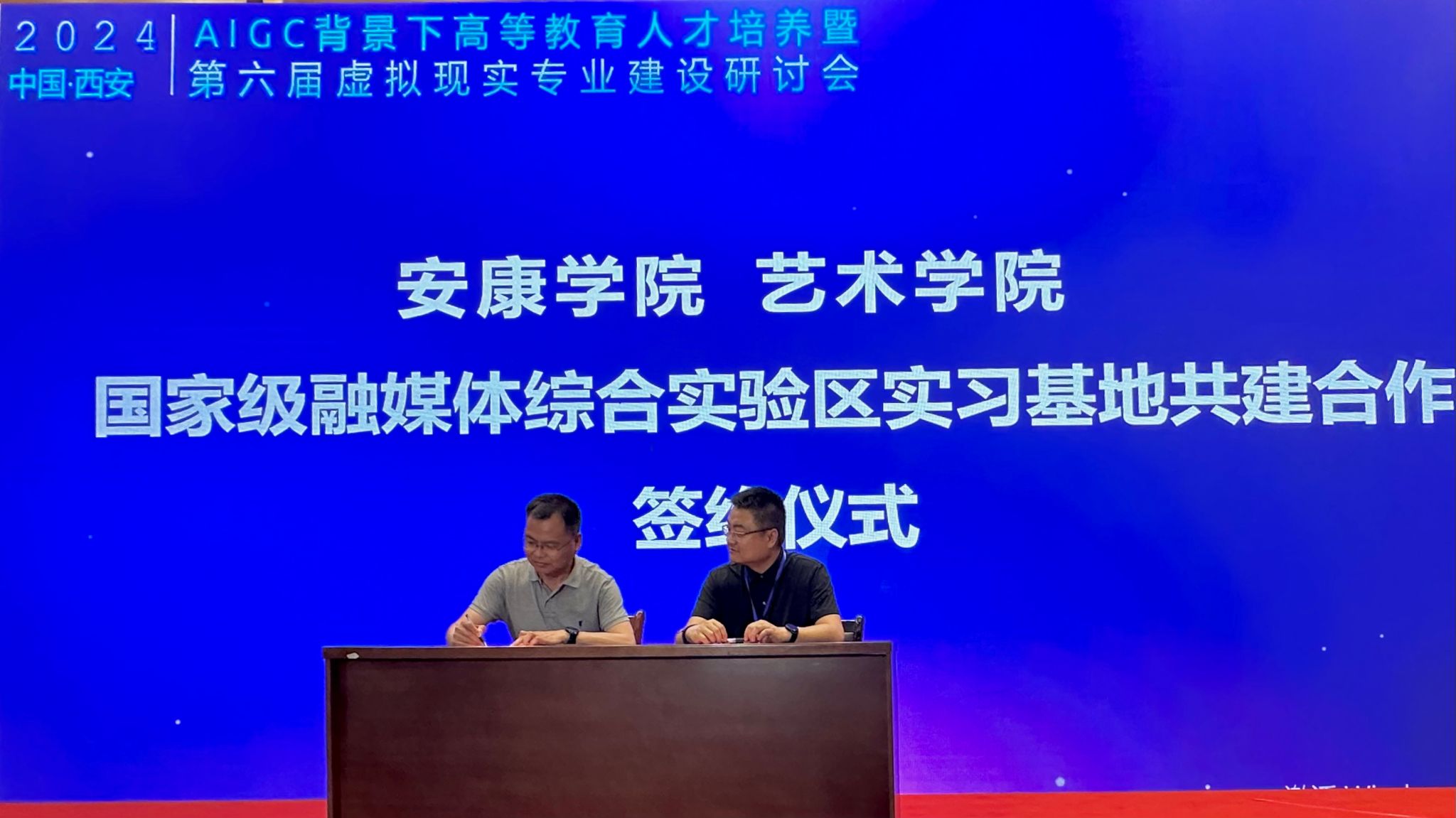 会议以“AIGC技术背景下高等教育人才培养”为主题,研讨虚拟现实技术专业课程体系、专业课程教学、实验教学及综合实践训练等相关建设工作。在会议上进行了Beat365唯一官方网站国家级融媒体综合实验区实习基地合作共建协议签约仪式,成党伟代表学院签约。