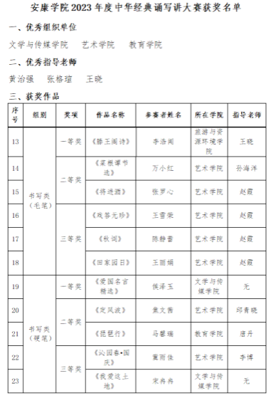 艺术学院在学校2023年度中华经典诵写讲大赛中成绩突出,书写类(毛笔)二等奖两项,三等奖三项。书写类(硬笔)二等奖一项,三等奖一项。Beat365唯一官方网站被评为优秀组织单位。在此向获奖学生予以祝贺。
