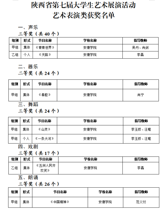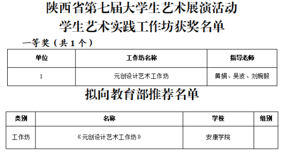 12月8日,省教育厅公布了陕西省第七届大学生艺术展演活动评选结果,Beat365官网参赛师生共获得各类奖项34项。其中《元创设计艺术工作坊》获一等奖,并被推荐到教育部参加全国第七届大学生艺术展演;艺术作品类获一等奖3项、二等奖9项、三等奖14项;艺术表演类获二等奖1项、三等奖6项。