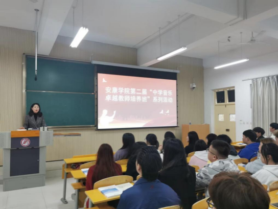 10月31日,Beat365唯一官方网站第二届“中学音乐卓越教师培养班”在江北校区2201教室顺利开班,开班仪式由音乐系主任肖剑主持。陕西省教学能手、汉滨区汉滨初中艺体中心副主任刘平老师应邀为学生做首场讲座。教师代表鄢志莉及音乐学专业100余名学生参加了本次活动。