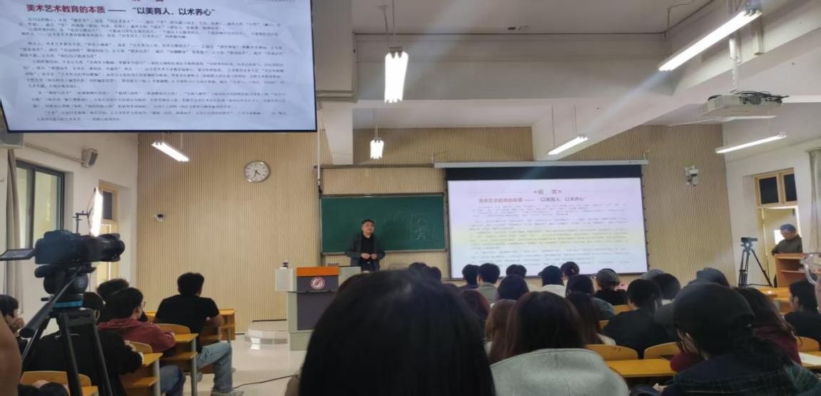 课堂上,刘晓东作为主讲专家,为学生深入的解读了美术教育“以美育人,以术养心”的深层内涵。他特别讲到,儿童美育的核心并非塑造专业小画家,而是通过艺术实践滋养儿童的耐心、自信等良好的心性,还要打破对于“儿童版画是成人版画缩小版”的固有认知,强调了儿童版画是契合儿童成长需求的独特艺术载体,要致力于培养儿童“能感知美、善于表达、敢于创造”的完整个体。