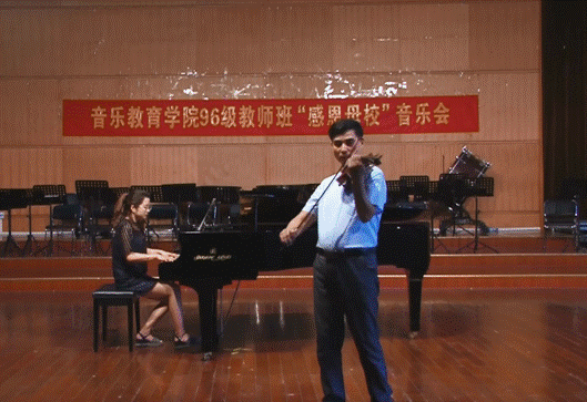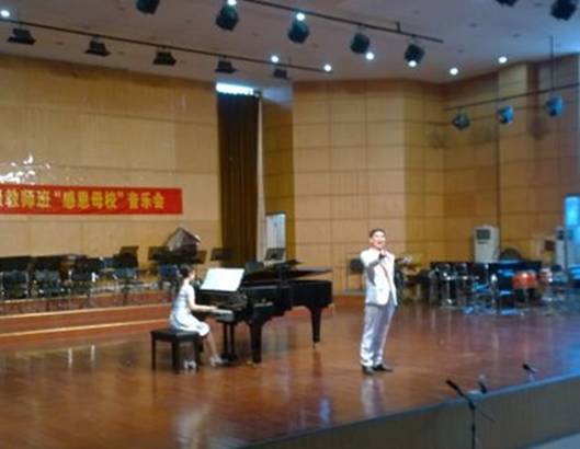 6月4日,Beat365官网学科带头人范义付副教授应邀参加由武汉音乐学院校友会主办的“感恩母校”音乐会。音乐会前,范老师作为代表向母校赠送了锦旗。音乐会上范老师演唱了歌曲《故土情》、演奏了小提琴协奏曲《梁山伯与祝英台》。