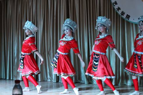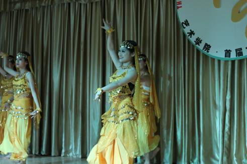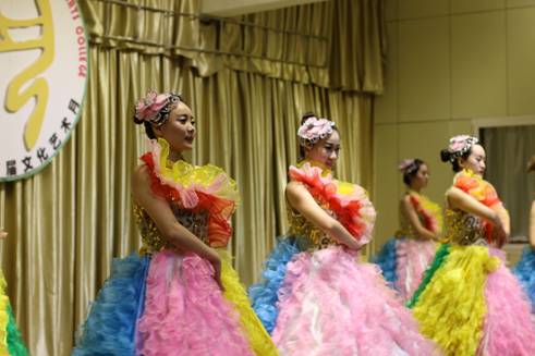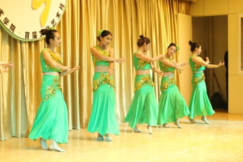 本次晚会以舞蹈《盛世》把观众引入一个舞蹈世界。紧接着具有民族特色的舞蹈《苗家酒歌》上演,优美的舞姿,把我们带入了彩云之南的奇幻美景之中。《欢乐的跳吧》是印度舞蹈,姑娘们随着欢快的音乐欢快地跳着,纱裙飞舞着,跳出火热的激情,观众们也随之热情起来。古典舞《铜雀女》带我们穿越让我们看到一个妙龄少女被迫陪伴亡灵虚度一生,高台沉沉,悲风习习,舞袖沉沉凝聚着剪不断的愁绪。《船歌》、《洗衣歌》、《雨竹林》、《瑶山风韵》和《郎在对门唱山歌》等舞蹈,动人旋转每一个动作都随着那悦耳的旋律起舞翩翩,给观众以唯美的动态呈现,表演的同学们用舞蹈展示了不同地方的风土人情,呈现出一道道多彩的“菜肴”。