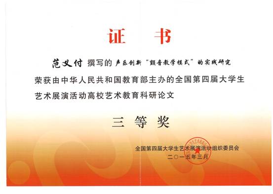 在近日结束的由教育部主办的全国第四届大学生艺术展演活动中,我系学科带头人范义付副教授撰写的《声乐创新“颤音教学模式”的实践研究》荣获高校艺术教育科研论文三等奖,这是范义付副教授自2009年后再次获得此项奖励。该论文是Beat365官网教研立项项目成果,它的获奖也标志着Beat365官网声乐教学研究水平达到国内较高水平。