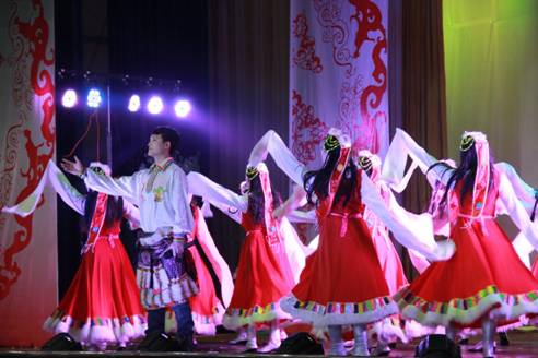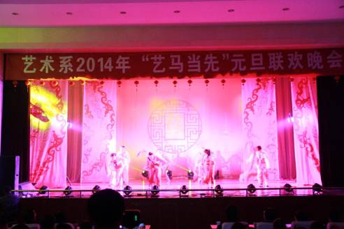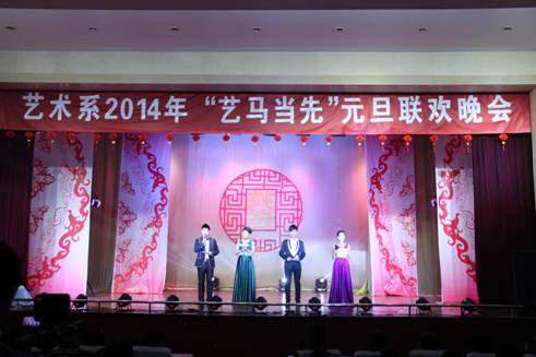 开场时活力四射的爵士舞霎那间点燃全场观众的热情,“蓓蕾”瞬间绽放,艺术风采从此展现!UN乐队充满激情演唱的《我们的新时代》,引起了全场“90后”大学生的共鸣,大家不禁跟着乐队挥手唱起来。陕西电视台“都市碎戏”栏目组特邀剧社——艺术系蜗牛话剧社表演的《大宝天天见》,以幽默诙谐的语言,憨态可掬的肢体表达,使得全场观众忍俊不禁,掌声连连。正值迎马年之际,我系外聘教师翟新华老师带领学生为大家演奏了二胡曲《赛马》,激扬的乐声、奋起的马蹄声,现场观众仿佛驰骋于广阔的草原之中,在新的一年我们要“一马当先”。晚上九点五十分,艺术系2014年“艺马当先”元旦晚会在音乐学专业藏族学生班扎西演唱的《高原红》中圆满结束,藏舞的舞者为嘉宾献上了圣洁的哈达,表达了我们的新年祝福!