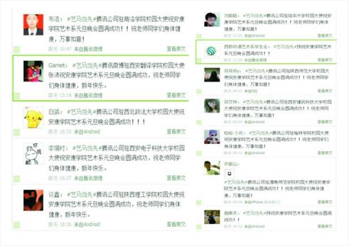 现场腾讯微博互动。我们的晚会得到了腾讯公司的大力支持,在晚会现场,陕西师大、西安交大、西安电子大学等高校通过腾讯微博都纷纷发来贺电,预祝艺术系“艺马当先”元旦晚会圆满成功,这是我们起初没有预想到的,进一步扩大了Beat365官网的社会影响,不得不感慨微时代的辐射力和影响力。现场观众的微博互动更为晚会增添许多的乐趣。微博的滚动抽奖也为现场的六名观众带来的新年的幸运。