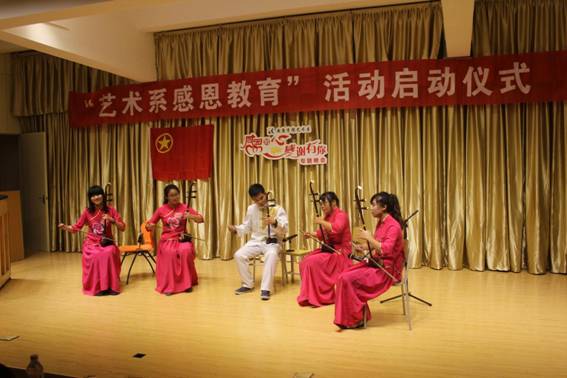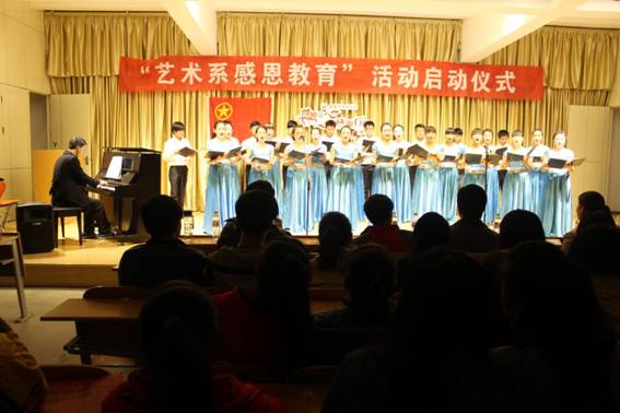 接下来,启动仪式进入第二个板块,进行由2013级音乐学专业学生主办的艺术系“感恩存心、感谢有你”感恩教育主题晚会。我系小虎合唱团演唱的曲目《师恩如歌》,悠扬的歌声,动情的表演,完美地演绎了和谐的师生情谊。朗诵《感恩我的祖国》,雄浑中透露着中华儿女的自豪之感,深情中流露出浓浓的爱国情思。