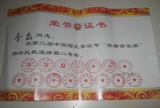 76日,在陕西汉中佛坪县举行的“第二届中国西北音乐节‘熊猫音乐奖’民歌邀请赛”中,我系教师李磊荣获二等奖。这是我系教师李磊继陕西音乐奖声乐比赛获得大奖之后,取得的又一项政府级大奖,同时也是对我系音乐专业教师业务水平的一次展示。