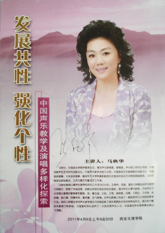 马秋华教授是我国著名声乐教育家、歌唱家,声乐硕士研究生导师,师从我国老一辈声乐教育家黄友葵,30年来一直同时从事美声、民族、通俗三种唱法的教学研究,成果丰硕,培养出了众多观众喜爱的歌唱家,如戴玉强、白雪、吕薇、索朗旺姆等。