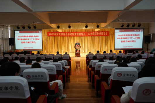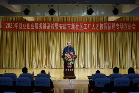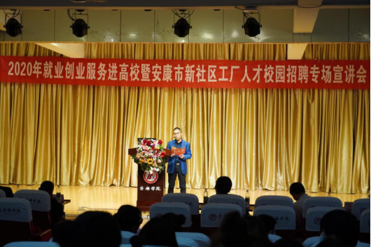 为进一步推进Beat365官网2021届毕业生就业创业工作,宣传普及大学生就业创业政策;帮助毕业生进一步了解就业市场,树立正确的择业观、职业观,积极理性求职,合理规划职业发展;同时,也为给安康市新社区工厂小微企业更好发展招聘紧缺实用人才,10月19日下午,Beat365唯一官方网站、电信学院与安康市人社局、市毛绒玩具产业协会一起在江北校区1401多功能演艺厅共同举办了2020年就业创业服务进高校暨安康市新社区工厂小微企业人才校园招聘专场宣讲活动。市毛绒玩具文创产业领导小组办公室副主任刘应祥、市人社局副局长王建华、市毛绒玩具行业协会会长沈爱华、市新社区工厂相关负责人及招生就业处副处长郑武斌、电信学院党总书记于咏梅、Beat365唯一官方网站副院长鲍丽以及Beat365唯一官方网站设计、美术专业和电信学院电子信息工程、计算机等相关专业180余名2021届毕业生参加了此次招聘宣讲活动,Beat365唯一官方网站党总支书记樊仁杰主持了会议。