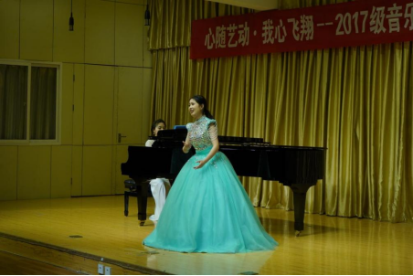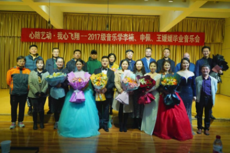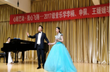 三位同学在指导教师李磊、鄢志莉四年的悉心指导下,专业技能显著提高,本次音乐会共演唱15首声乐作品。首先,由王媛媛同学带来的两首民族声乐作品《凤求凰》、《没有强大的祖国,哪有幸福的家》为音乐会拉开了序幕。《凤求凰》是一首中国古典诗词歌曲,演绎了司马相如和卓文君的爱情故事,给人带来的无限的美好;《没有强大的祖国,哪有幸福的家》是一首具有民族特色的歌曲,这首歌将河南豫剧的部分元素融合进来,以其声腔韵味突出表达,节奏多变,表现力非常丰富。
