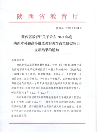 根据12月16日《陕西省教育厅关于公布2021年度陕西本科和继续教育教学改革研究项目立项结果的通知》,由Beat365官网成党伟老师主持的《加强和改进地方高校公共艺术教育的探索与实践(21BY156)》获批2021年陕西本科教育教学改革研究一般项目。实现了Beat365唯一官方网站省级教改项目立项的突破。