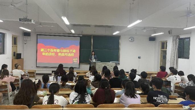 团课伊始,黄娟与同学们一起重温了党的十八大以来习近平总书记鼓励广大青年勇担时代使命的青春寄语,围绕“在第二个百年奋斗目标之下,当代青年应该担负什么样的历史责任、如何肩负起历史责任、进而成为党和人民需要的栋梁之才?”的问题,从责任、挑战与选择三个方面进行了讲解。首先,她系统阐述了第二个百年奋斗目标及其规划在政治、经济、文化以及社会等方面对当代青年提出的责任担当要求,希望同学们认真学习习近平总书记在庆祝中国共产主义青年团成立100周年大会上的重要讲话精神,提高政治站位,理解和把握时代赋予青年的使命责任,切实发挥青年主力军作用,坚定自信,奋发有为。接下来,黄娟分析了要实现第二个百年奋斗目标我们在经济发展、意识形态、科技竞争等方面尚面临着巨大挑战,任务艰巨,任重道远,需要广大青年坚定地把自身理想同国家发展、民族振兴紧密联系起来,努力学习,勇挑重担。最后,黄娟深入阐释了新时代给予青年广阔的发展空间,给予青年人生出彩的机会,要树立正确的世界观、人生观和价值观,志存高远,向上向善,做可爱、可信、可为的新时代青年。