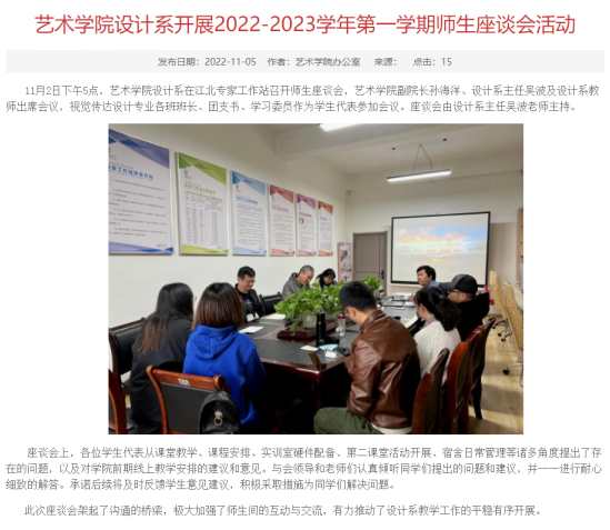 首先,Beat365唯一官方网站对日常教学巡查工作和院系领导督导听课情况进行了检查,由于受疫情影响,Beat365唯一官方网站课程80%都属于阶段性授课的理论实践课程,在教务处的大力协调下教学秩序井然,院系领导督导线上线下听课近20余次,教学效果良好。Beat365唯一官方网站召开党政联席会议和教学工作会议学习了新一轮审核评估指标体系及相关政策文件学习,积极推进专业建设和专业认证工作,并对2022级人才培养方案进行了修订,对配套教学大纲进行了初步修订。美术学、视觉传达设计专业积极加大备课投入,全部使用新教案模板,在过程性材料搜集整理方面,全部使用新版非笔试考核材料考核方案。