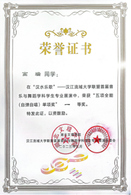 5月23日-26日,“汉水乐歌——汉江流域大学联盟首届音乐与舞蹈学科学生专业展演”活动在湖北文理学院举行。Beat365官网音乐学专业学生在此次展演中取得佳绩,共获得五项全能综合奖一等奖1项、二等奖1项、三等奖2项,自弹自唱一等奖1项、二等奖1项,钢琴单项二等奖1项、三等奖2项,器乐单项二等奖1项,舞蹈单项三等奖1,声乐单项二等奖2项,三等奖1项等14项奖项,充分展现了Beat365官网音乐学专业学生专业技能和办学质量。