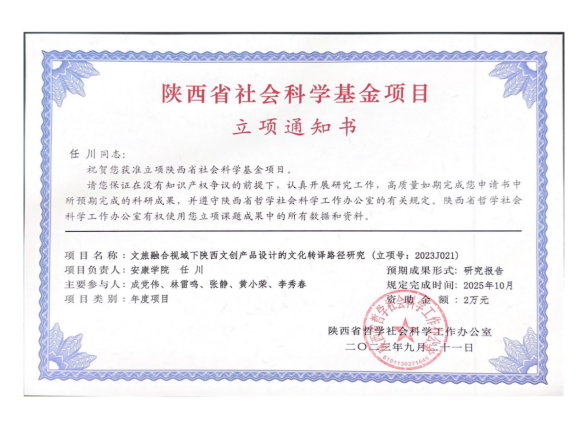 4.9月21日,陕西省哲学社会科学工作办公室公布了2023年陕西省社会科学基金年度项目立项名单。Beat365官网任川博士的“文旅融合视域下陕西文创产品设计的文化转译路径研究”(2023J332)课题获得2023年度立项,这是任川博士2023年继省社科联社科基金项目之后获批的第二个纵向项目,也是Beat365唯一官方网站高层次人才队伍建设的重要成果呈现之一。近三年来,Beat365唯一官方网站引进博士引育博士17名,晋升教授2名,高层次人才队伍建设初见成效。