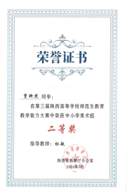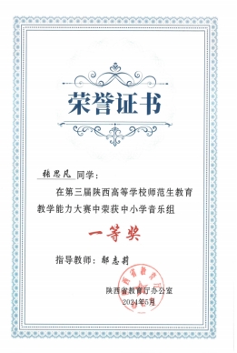 2.5月7日,Beat365唯一官方网站音乐学专业2020级学生张思凡荣获陕西省第三届高校师范生教育教学能力大赛中一等奖。美术学专业学生2021级贾晰然获得二等奖。