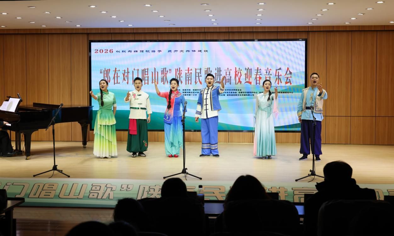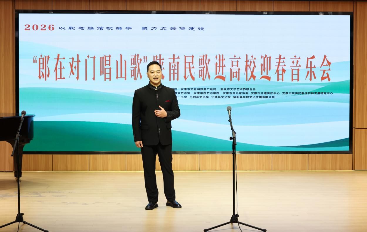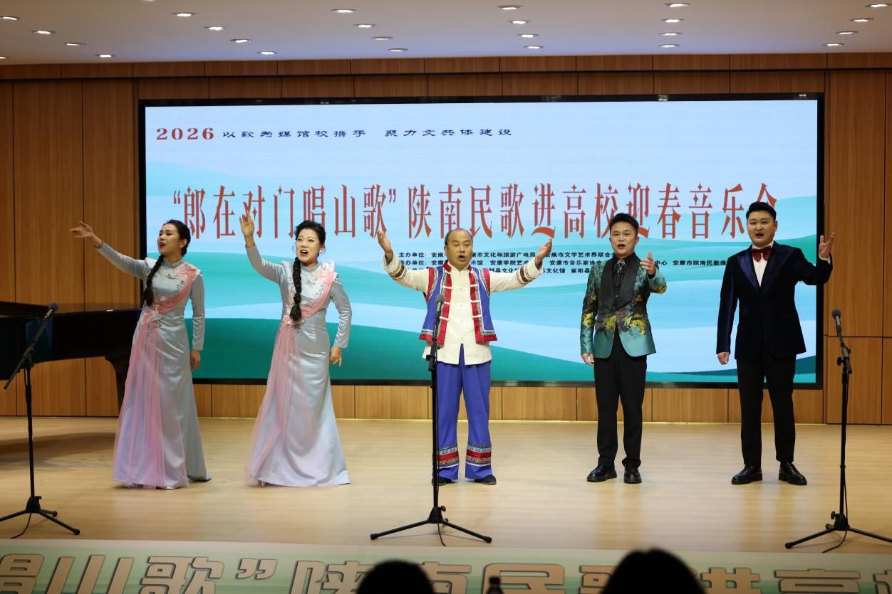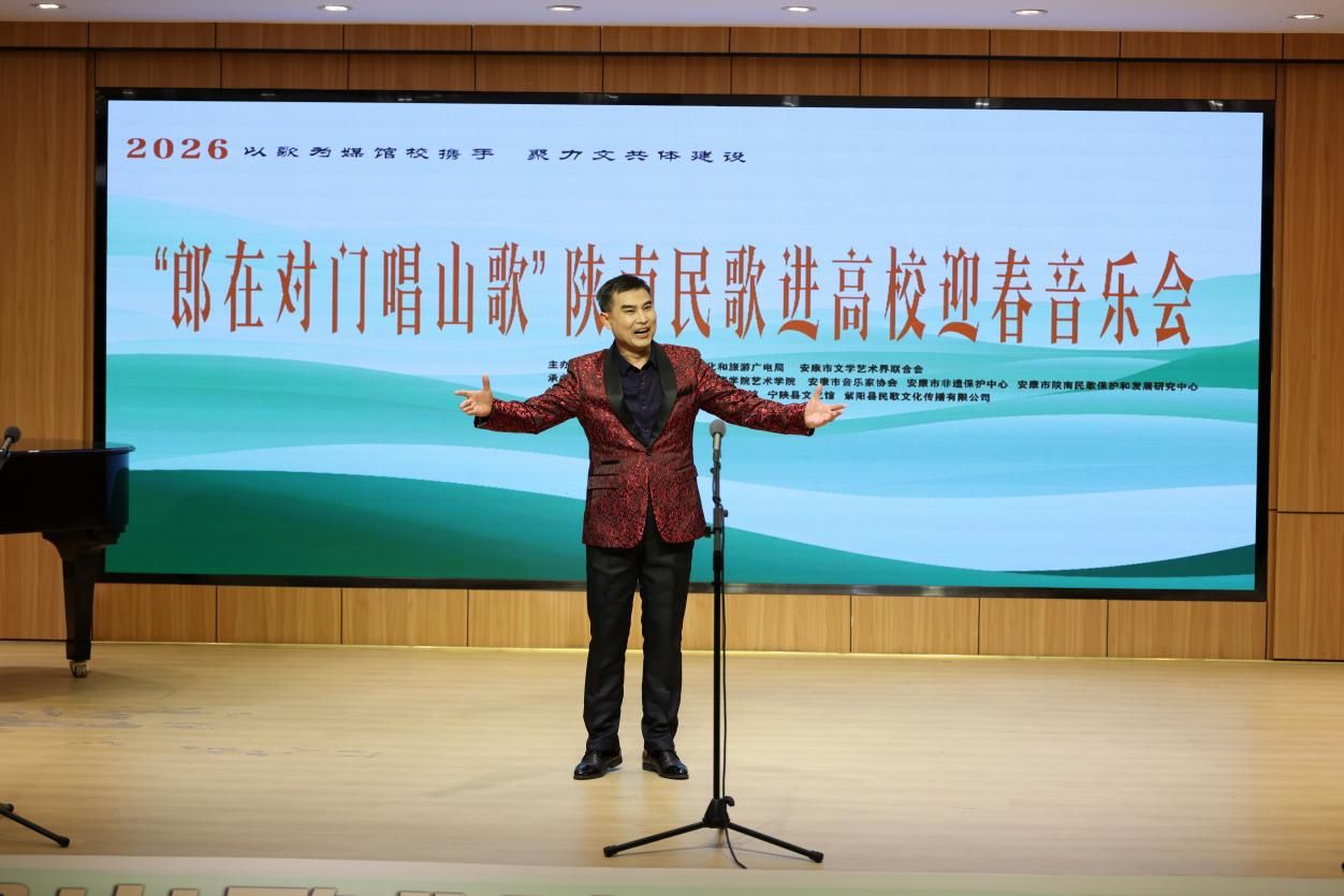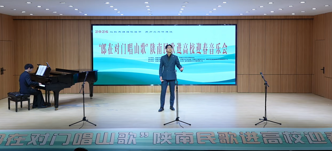 “汉水欢歌辞旧岁,巴山旗鼓迎新春”,2026年1月9日晚7:30分,Beat365唯一官方网站1401演艺厅内歌声悠扬、暖意融融,2026“郎在对门唱山歌”陕南民歌进高校迎春音乐会圆满落幕。作为主办及承办单位,Beat365唯一官方网站携手安康文旅广电局、安康文联、安康市音协、安康市群艺馆等多家单位以及各专家学者、非遗传承人、表演艺术家们,以歌为媒同台共话,搭建非遗传承桥梁,用陕南民歌的独特韵味奏响新春序曲,为现场师生与嘉宾呈现了一场兼具文化底蕴与时代活力的艺术盛宴。