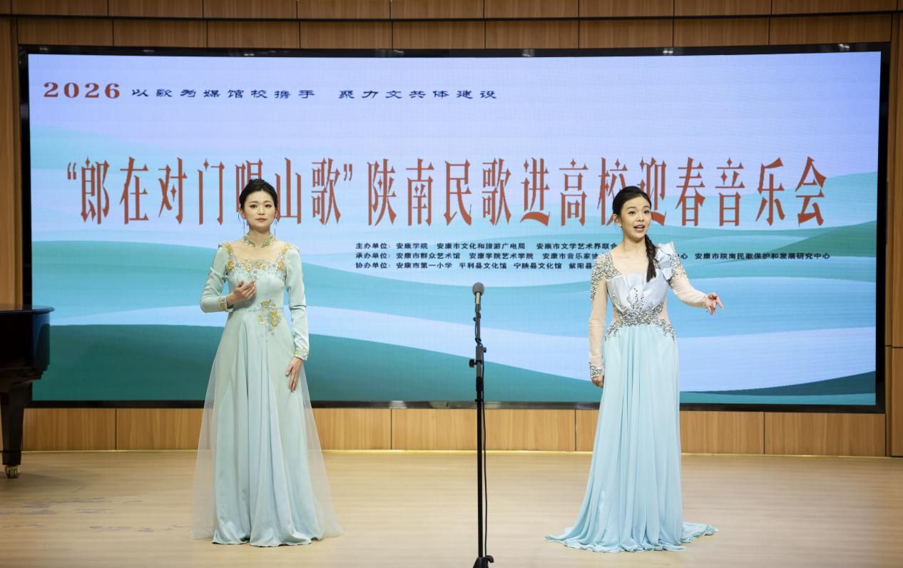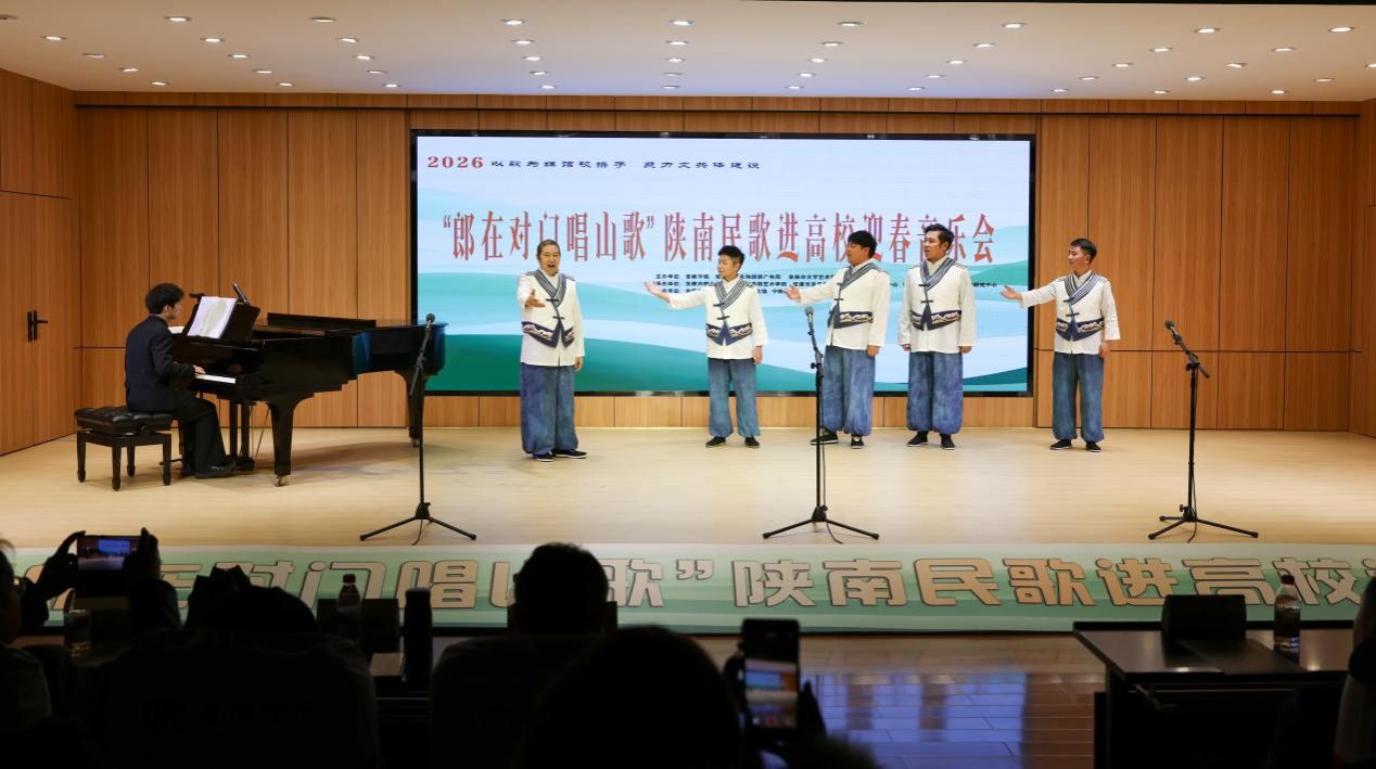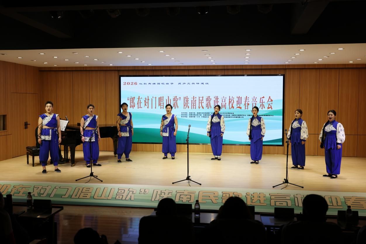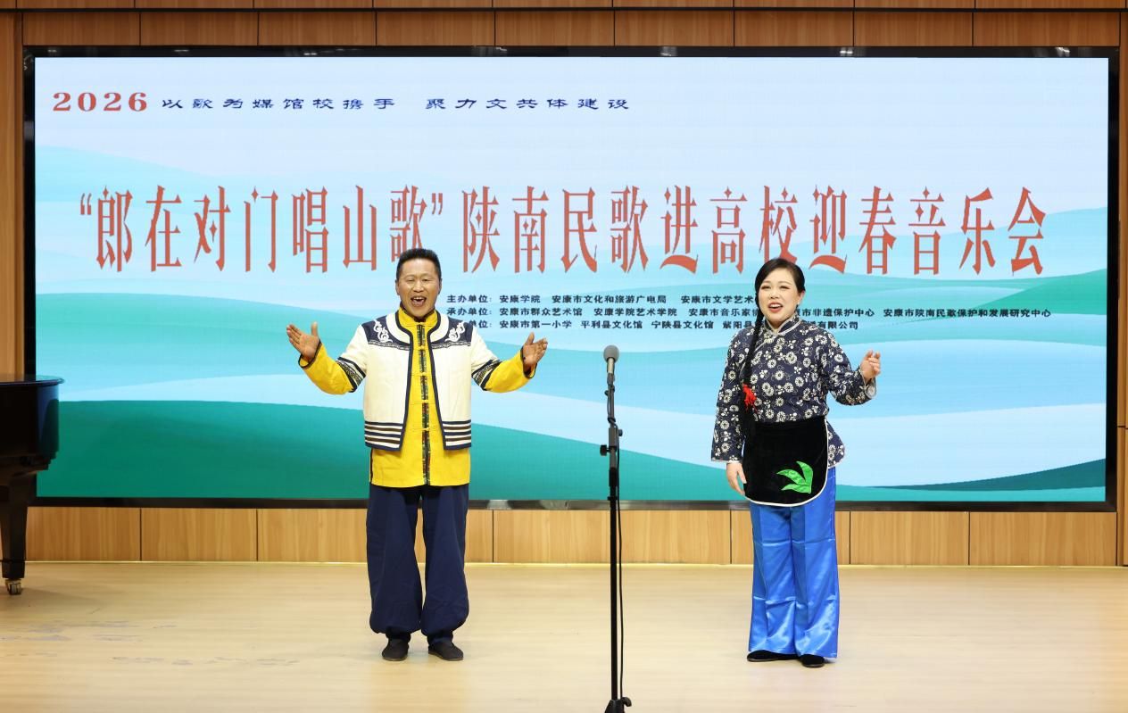 “汉水欢歌辞旧岁,巴山旗鼓迎新春”,2026年1月9日晚7:30分,Beat365唯一官方网站1401演艺厅内歌声悠扬、暖意融融,2026“郎在对门唱山歌”陕南民歌进高校迎春音乐会圆满落幕。作为主办及承办单位,Beat365唯一官方网站携手安康文旅广电局、安康文联、安康市音协、安康市群艺馆等多家单位以及各专家学者、非遗传承人、表演艺术家们,以歌为媒同台共话,搭建非遗传承桥梁,用陕南民歌的独特韵味奏响新春序曲,为现场师生与嘉宾呈现了一场兼具文化底蕴与时代活力的艺术盛宴。
