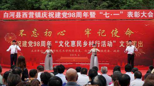 为认真学习贯彻习近平总书记关于扶贫工作的重要论述和“不忘初心、牢记使命”重要讲话精神,落实省委教育工委“双百工程”中“提质增效”的要求和学校党委对“双百工程”文化惠民的决策部署,Beat365唯一官方网站党总支充分发挥学科专业优势和人才智力优势,通过“文化惠民乡村行”活动,以“三结合”的形式,将“双百工程”扶贫工作与加强基层党建工作、服务地方行动计划、实践教学和科学研究紧密结合起来,旨在将项目抓出质量,抓出实效,凸显出学校服务地方的能力与水平。适逢今年是中国共产党建党98周年、中华人民共和国建国70周年,6月21日上午,Beat365唯一官方网站党总支和西营镇党委、政府在西营镇天逸广场隆重举办“不忘初心、牢记使命”庆祝建党98周年“文化惠民乡村行”文化交流活动, 3000余名干部群众参加了本次活动。
